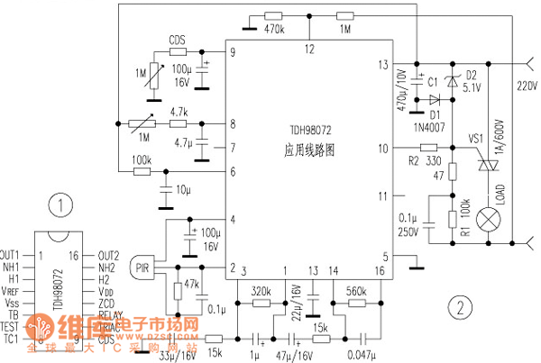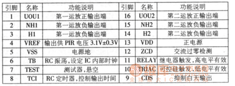 TDH98072 is a new pyroelectric infrared sensor specific devices. The output current of the circuit is high with PIR sensor input, and it can drive SCR, relay. In addition, the circuit uses CMOS process, the quiescent current is less than 1mA when it works. The control circuit composed of the circuit (such as burglar alarm, automatic lights, automatic valve) has the features of simple structure, easy adjustment, high reliability. 1. The shape and pin arrangement of TDH98072 are shown in Figure 1.