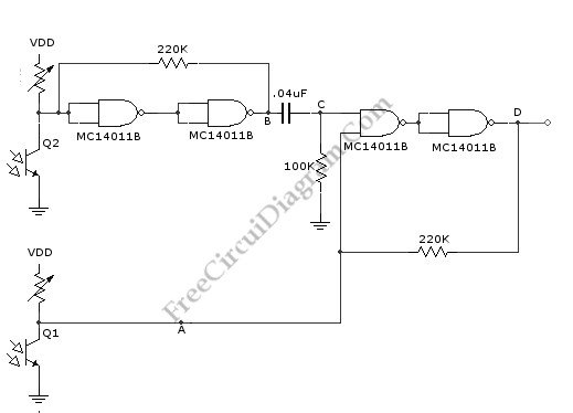 This is a one direction motion sensor circuit. This motion sensor circuit is used to detects an object passing in one direction, ignoring an object that going to opposite way. This circuit uses two sensors to identify the movement only in one direction. The basic principle of this circuit is simple, where one sensor is used to generate a short pulse, and the other sensor is used to block of turn of the gate. The phototransitors give high output on their collectors when there is an object blocking the light. By a 0.4uF differentiator capacitor, the interruption of light at Q2 sensor will produce short pulse at point C. But this short pulse will only appear at the output if a high signal appears at A. This condition will be satisfied if the light to Q1 is blocked by the object when the object is passing through Q2, means that the direction should be from Q1 to Q2. Here is the schematic diagram of the circuit: