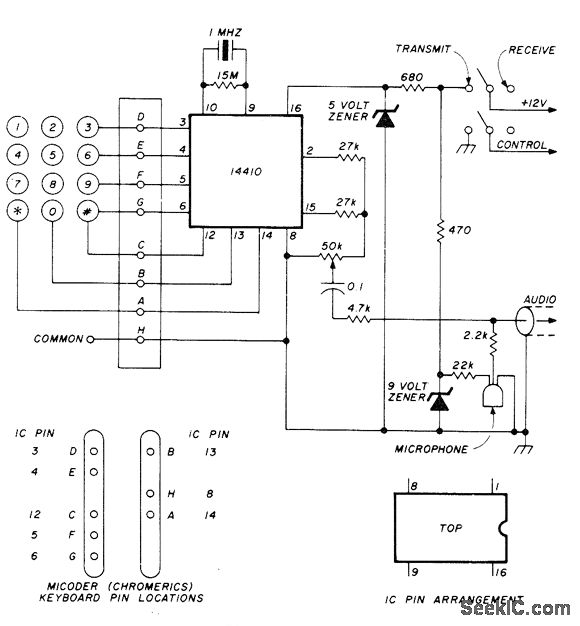 Crystal-controlled encoder using 14410 tone encoder operates from 12-V supply to provide good frequency stability along with correct balance between high and low tones. 50K level adjustment pot can be screwdriver type.-G. A. Wilson, The Micoder: Some Improvements, Ham Radio, Nov. 1978, p 42-43.