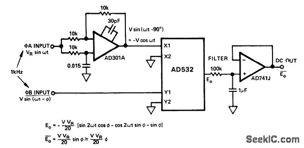 Phasemeter for sinusoidal signals. This circuit provides a good linear measure of phase for small angles up to 14° and a sinusoidal measure of angles between +90°and -90°(courtesy Analog Devices, Inc.).