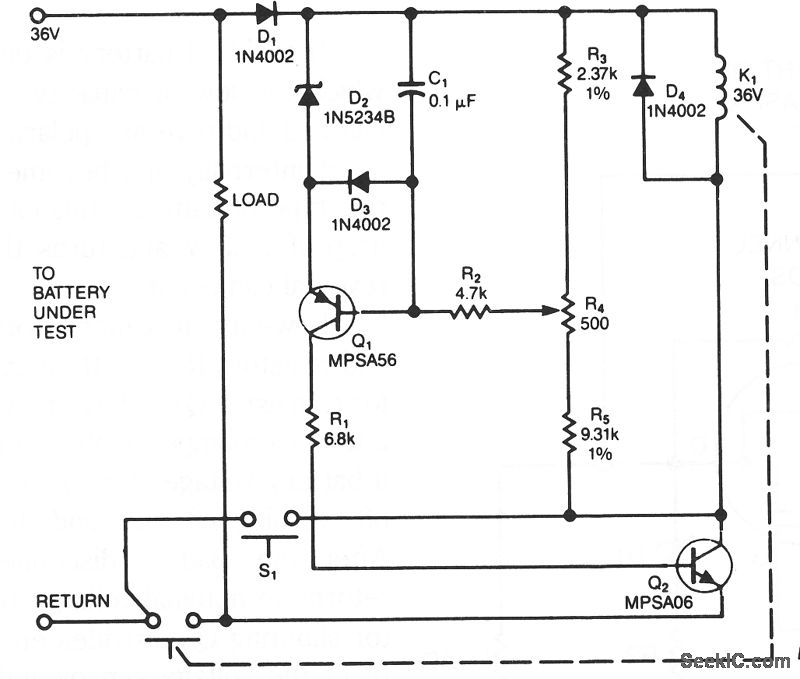 After you connect the battery, nothing happens until you depress pushbutton switch S1, which allows relay K1 to energize. When you release S1,,the relay remains on only if the battery voltage is above the minimum level. You preset this threshold-to 31.5 V when testing 36-V batteries, for example-using R4.Q1 begins to turn off as the battery voltage drops. Once the threshold level is reached, Q2 also begins to turn off, and its rising collector voltage provides positive feedback to the base of Q1, accelerating the turn off. When Q2 turns off, the relay drops out, disconnecting the battery from its load.