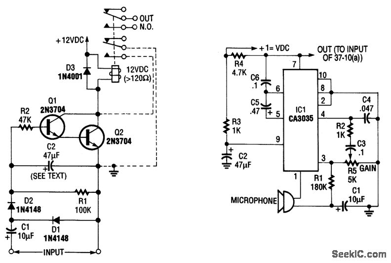 By using a microphone,high-gain amplifier(Fig.37-10(b)),and detector-relay driver(Fig.37-10(a)asound-detecting alarm system can be constructed.If you want a latching setup,make the dotted connection to the relay shown h Fig.37-10(a)