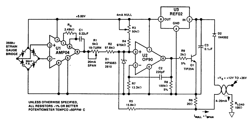 In this loop-powered strain-gage sensor application, a 50-mV full-scale(FS)bridge output is amplified and calibrated for a 4-20-mA transmitter output. Power is fumished by the remote loop sup-ply of 12 to 36 V.