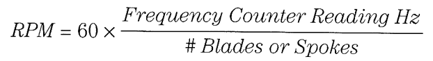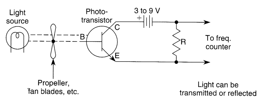 Use of a phototransistor and light source can enable a frequency counter to act as a tachometer:The light source is interrupted by the number of propeller blades, fan blades, spokes, or other marking. R can be anywhere from 1 to 100 kΩ. Try several values for best results.