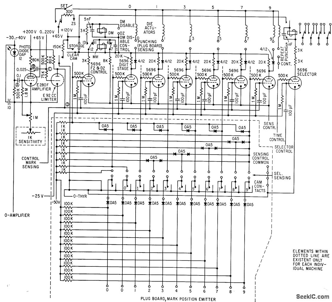 Automatically transcribes up to 40 pencil marks on specially printed 90-column cards into machine code and block-punches information into cards in any desired format at 150 cards per minute -F. A. Frankl, Transcribing Field Markings by Optical Scanning, Electronics, 34:31, p 49-51.