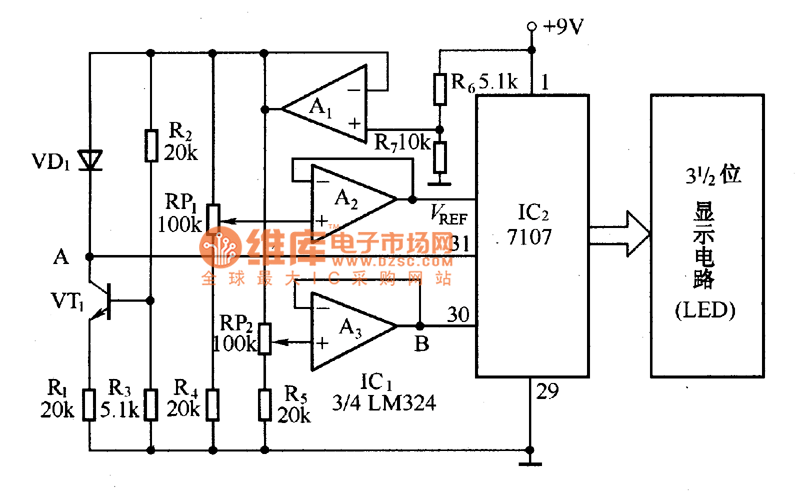 The circuit shown in the picture is the digital temperature meter circuit which uses temperature-sensitive diode as the temperature-measurement element. It is mainly made up of the A/D converter 7107, operational amplifier LM324, 3-digit LED display circuit and temperature-sensitive diode and so on. It features high accuracy, good stability, versatility, ease of use and so on. Its temperature measurement range is 0℃~100℃ with accuracy ±1℃.