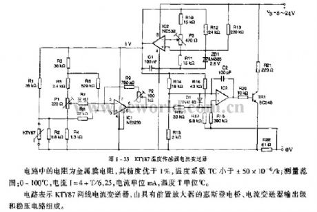 Resistors in the circuit use metal film resistors, and its accuracy is better than 1%, and the temperature coefficient TC is less than ± 50 × 10-6 / k; measuring range: 0 to 100 ° C , the current I = 4 + T/6.25, current unit is mA, and temperature T unit is ℃. The circuit is composed of KTY87 two-wire current transducer, Wheatstone bridge with preamplifier, current transmitter output stage and regulator.