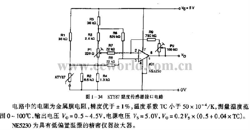 The resistor in circuit uses a metal film resistor, and its precision is better than ± 1 %, temperature coefficient TC is less than 50 × 10-4 / K, measurement temperature range is between 0~ 100 ℃, output voltage Vo = 0.5 ~ 4.5V, supply voltage VS = 5.0 V, Vo = 0.2VS × (0.5 +0.04 × TC). NE5230 is a low bias temperature precision instrument amplifier.