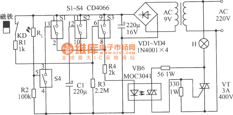 See as the circuit, in the 4 teams of analog electric switches(SI~S4), S1, S2 and S3 are in parallel connection, and they are used in the time delaying circuit, when they are connected with the power supply, they drive the dual-way transistor VT by R4 and VB6, VT directly control the hall lights; S4 and the external light dependent resistor RL form the outside ray detection circuit. When the door is closed, the closed type dry reed pipe KD, which is installed on the door frame, is affected by the magnet and it cut off, then S1, S2 and S3 are in open state. When the owner comes home at night, the magnet is away from KD, the KD touch spot is closed.