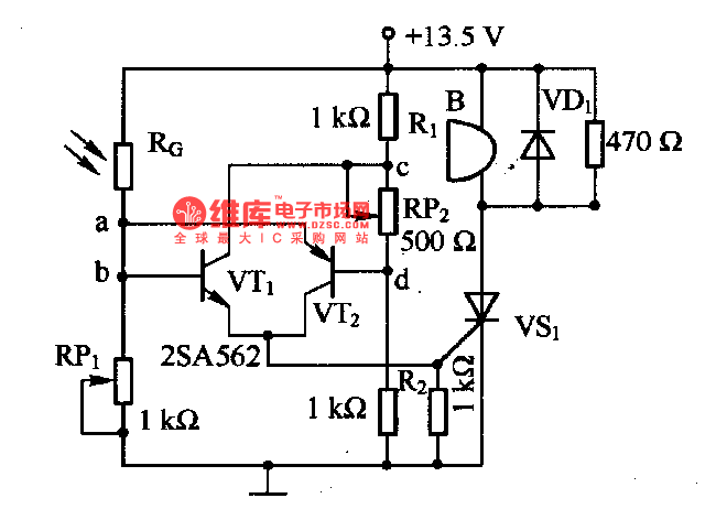 This is a luminous flux test circuit with optical resistors. In the circuit, the optical resistor RG forms a bridge with RP1,RP2,R1 and R2; RP1 is used to adjust the balance of the bridge; RP2 is used to adjust the sensitivity of the circuit. If we adjust RP1 to make the voltages on a and c are equal, then VTl and VT2 stop, and the thyristor of VSI is off. In the meantime, if the resistance of RG changes, the bridge will be unbalanced, and a voltage will be generated among a-c, then VTI and VT2 are on, the thyristor of VSI is also on, the buzzer B will buzz to inform the luminous flux of the test.
