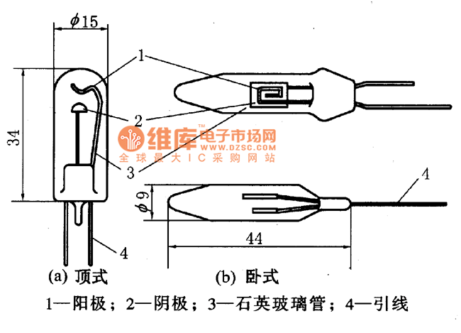 The structure of UV sensor is as shown in the picture. (a)the top structure, (b) the horizontal structure. In the quartz glass tube there are two electrodes, oneis the anode, the other is the cathode. A large quantity of special gas is sealed in the quartz glass tube.