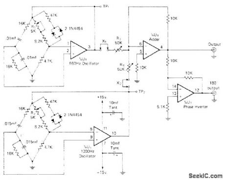 Produces two audio frequencies with all harmonics and cross products down 40 dB or more, as required for accurate testing of amateur SSB equipment. Two sections of Raytheon 4136D quad opamp serve as Wien-bridge audio oscillators, one at 1000 Hz and one at 660 Hz. Silicon signal diodes in each bridge act as nonlinear stabilization elements. Third section of opamp adds sine waves, and fourth section is simple inverter with gain of n for push-pull or balanced output. With all four pots at midvalue, adjust R2 for 12 V P-P at TP2 and adjust R4 for 12 V P-P at TP2. Open X2 and adjust R3 to give 12 V P-P from either output terminal to ground, then close X2 and repeat for X1 and R4. Output should now be 660 and 1000 Hz added linearly as required, with no cross-products. Use regulated ±15 V supply.-H. Olson, A One-Chip, Two Tone Generator, CQ, April 1974, p 48-49. (View)