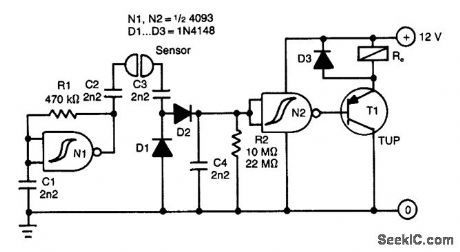 The sensor is an RC oscillator in which a water-absorbent plastic film is the insulator in the capacitive element. The capacitance of the film increases with the amount of water it absorbs from the air, and thus reduces the oscillation frequency. A frequency counter produces a digital output that represents the change in frequency and hence the change in relative humidity. The sensor can be used to measure humidity in the atmosphere, in the soil, and in industrial gases, for example. A Schmitt-trigger-type IC is con-nected to the capacitor, which consists of a film of a commercially produced sulfonated fluorocarbon polymer, 2 in. (5.08 cm) square, sandwiched between perforated metal plates. The oscillation frequency decreases almost linearly from about 100 to 16 kHz as the relative humidity increases from about 20 to 76%. (View)