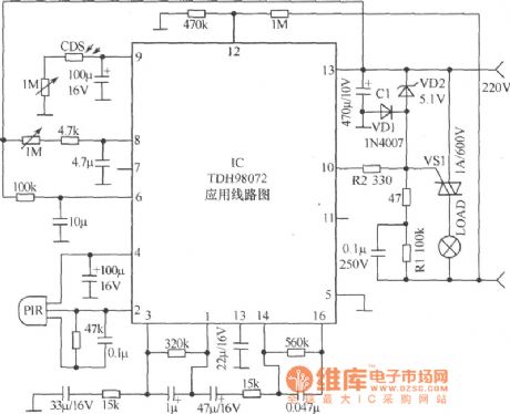 This circuit is composed of the novel pyroelectric infrared sensing specific device TDH98072. This control circuit has the advantages of simple circuit, easy to adjust and high reliability. And this device can be used to assemble other control circuits such as the anti-theft alarm, the automatic control lights and the automatic water valve.etc. The photoconductive resistance CdS uses the light resistance which is lower than l00kΩ or the dark resistance which is higher than 3.3MΩ. The pyroelectric infrared sensor PIR can use any kinds of small pyroelectric probe such as the ANM1 type. (View)