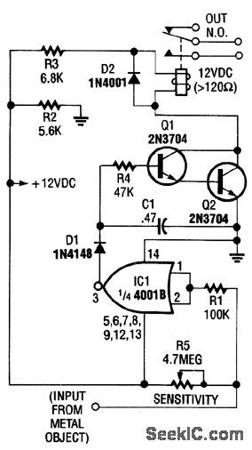 This touch sensor uses the 60-Hz hum pickup by the human body to drive a detector and relay drivers, Q1 and Q2. R5 controls sensitivity of the circuit. (View)