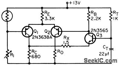 Provides delay in sensor control until industrial process and system are started up and in normal operating mode. Delay is obtained with R-C network in additional transistor stage Q3.Photocell and R1 are interchangeable depending on polarity of control required from output.-L. T. Medveson, Time-Delayed Schmitt Sensor, EEE,14:7, p104. (View)