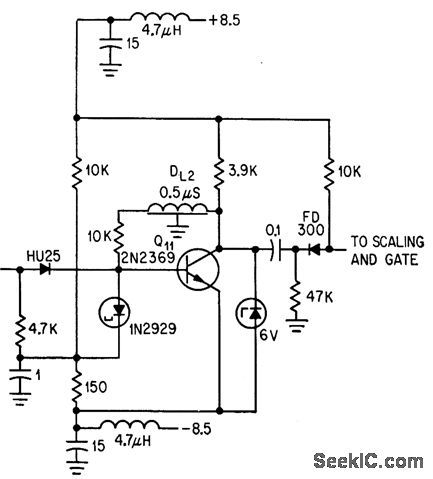 Tunnel-diode 1N2929 senses pulse height through isolating unijunction diode HU25.Voltage input signals above preset thresh-old give negative output pulse for scaler.-R. Cuikay and T. Callhan, Orbiting Observatory lo Measure Stars' Dim Light, Electronics, 37:9, p 28-31. (View)