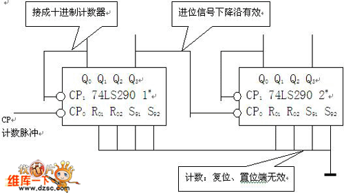 Define the level of integration counter. 1 # chip is low (equivalent to one bit) and 2 # chip is high (the equivalent of ten). Start counting from the low bit and send the counting pulse CP into 1# (low) the CP terminal of integrated counter.