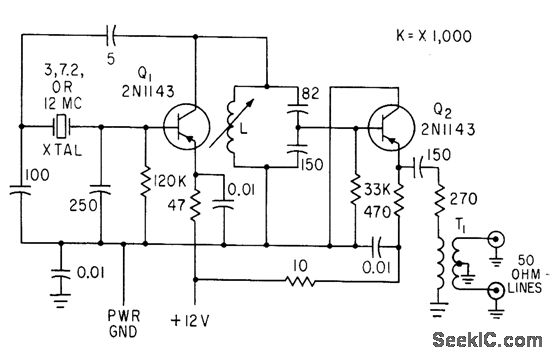 Transistorized crystal oscillator Q1 and emitter-follower Q2 feed 1 V rms into two balanced transmission lines going to standing-wave detector.-O. C. Haycock, and K. D. Baker, Measuring Antenna Impedance in the lonosphere, Electronics, 34:2, p 88-92.