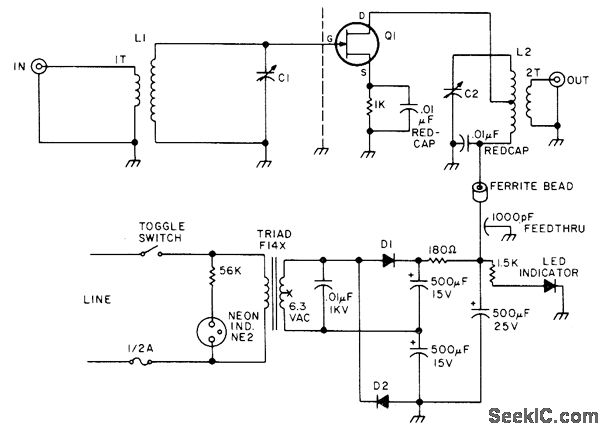 Simple self-powered preselector using FET improves overall noise figure of shortwave receiver along with sensitivity in 14-30 MHz portion of HF band. Also helps reduce cross-modulation from strong out-of-band shortwave broadcast stations. C1 and C2 are 50-500 pF Miller 160B. L1 is 10 turns No. 22 on 750-10 Micrometals core with 1-turn link. L2 is 10 turns No. 22 with center tap and 2-turn link on 750-10 core, Q1 is MPF102, HEP-802, or HEP-F0015. D1 and D2 are 1N4002 or HEP-R0051.-H. Olson, The S38 Is Not Dead!, 73 Magazine, Nov. 1976, p 88-89.