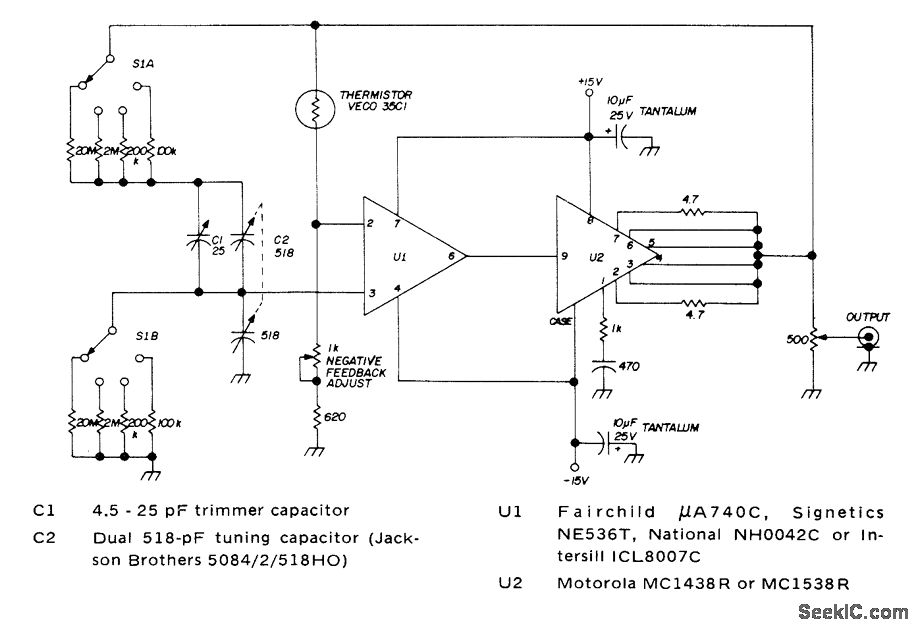 Tunable wide-range Wien-bridge audio oscillator is switched to cover 15-200 Hz, 150-2000 Hz, 1.5-20 kHz, and 3-40 kHz. U1 is high-input-impedance opamp in bridge circuit using thermistor as nonlinear feedback element. C1 is adjustable in series branch of bridge to compensate for capacitance (about 10pF) of ungrounded common terminal of dual tuning capacitor. Use ±15V dual regulated supply.-H. Olson, Integrated-Circuit Audio Oscillator, Ham Radio, Feb. 1973, p 50-54.