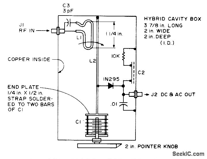 Cavity version of basic crystal detector was developed for use chiefly in 220-MHz and 450-MHz amateur bands. C1 is 25-pF tuning capacitor, and C2 is 1 x 2 inch brass plate insulated from sheet-copper cavity by 0.005-inch Teflon sheet or mica. L1 is 3-inch length of 1-inch copper strap.-B. Hoisington, Tuned Diode VHF Receivers, 73 Magazine, Dec. 1974, p 81-84.