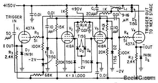Provides all possible 16-bit serial binary words at 10-Mc rate, to simulate expected input of high-speed computer circuits. Four identical binary stages are used in word generator. Speed is derived from high-transconductance tetrodes.-R. G. Norquist, Testing High-Speed Digital Computer Circuits, Electronics, 32:29, p 50-51.