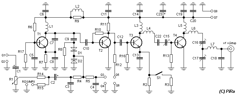 This small FM transmitter includes a limiter, a microphone amplifier and a PLL digital tuning. All the parts are placed on one circuit board. The RF power is switchable between 1W and 0,2W. The schematic diagram is divided into three parts: RF part (numbered from 1), PLL (numbered from 30) and audio part (numbered from 50).