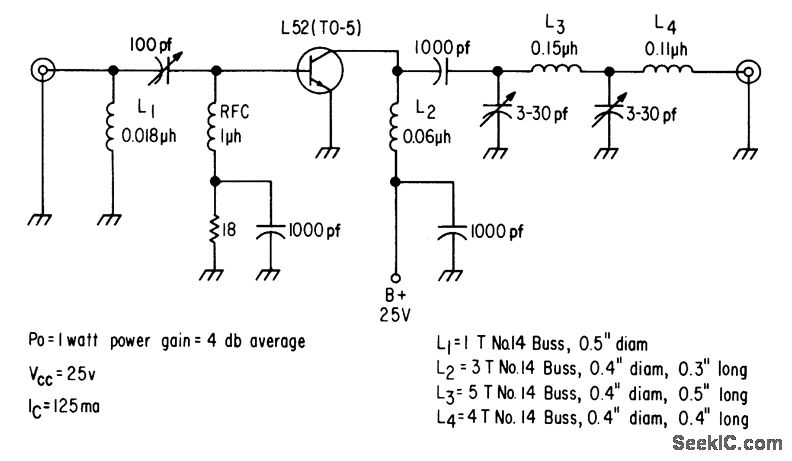Single L52 feeds 1 w to 50-ohm antenna through pi-L network. Power gain is 4 db and efficiency is 30% for class C operation.-Texas Instruments Inc., Solid.State Communications, McGraw-Hill, N.Y., 1966, p 323.