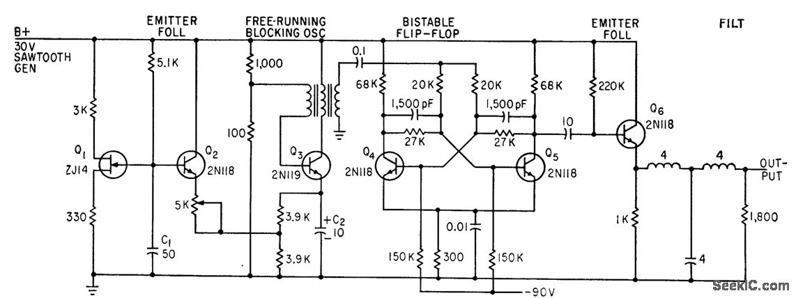 Used to lest servos and related equipment. Sawtooth waveform developed by unijunction transistor circuit is used to key blocking oscillator.-M. Rosen, Subaudio Swapt Signal Generator, Electronics, 33:17, p 67-68.