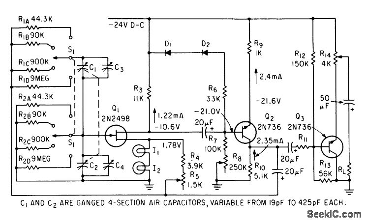 Range is covered in four steps. Two-stage oscillator is followed by buffer that delivers 3.5 v to 2,000-ohm load.-V. Glover, Using a New Device: Field-Effect Transistor Oscillators, Electronics, 35:51, p 44-46.