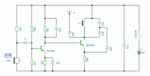 Notes:I have used a pair of BC548 transistors in this circuit. Although not strictly RF transistors, they still give good results. I have used an ECM Mic insert from Maplin Electronics, order code FS43W. It is a two terminal ECM, but ordinary dynamic mic inserts can also be used, simply omit the front 10k resistor. The coil L1 was again from Maplin, part no. UF68Y and consists of 7 turns on a quarter inch plastic former with a tuning slug. The tuning slug is adjusted to tune the transmitter. Actual range on my prototype tuned from 70MHz to around 120MHz. The aerial is a few inches of wire. Lengths of wire greater than 2 feet may damp oscillations and not allow the circuit to work. Although RF circuits are best constructed on a PCB, you can get away with veroboard, keep all leads short, and break tracks at appropriate points.One final point, don't hold the circuit in your hand and try to speak. Body capacitance is equivalent to a 200pF capacitor shunted to earth, damping all oscillations. I have had some first hand experience of this problem.