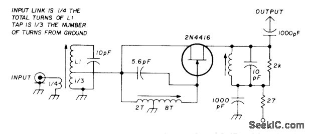 Combination of grounded-gate and grounded-source connections uses bridge arrangement for neutralizing feedback capacitance between gate and drain.Input impedance is transformed in parallel between gate and ground to provide necessary wideband characteristic. Noise figure is between 1 and 2 dB, with gain of about 15 dB. Circuit is unconditionally stable, and combines optimum matching for best noise, lowest input SWR, and high power gain.-U. Rohde, High Dynamic Range Two-Meter Converter, Ham Radio, July 1977, p 55-57.