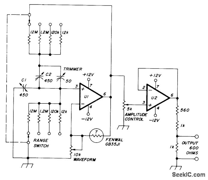 Wien-bridge sine-wave oscillator using two RCA CA3140 opamps covers frequency range with less than 0.5% total harmonic distortion. Adjust 10K pot for best output waveform. Maximum output into 600-ohm load is about 1 VRMS. Opamps are direct replacements for 741 but have higher input impedance and better slew rate.-C. Hall, New Op Amp Challenges the 741, Ham Radio, Jan. 1978, p 76-78.