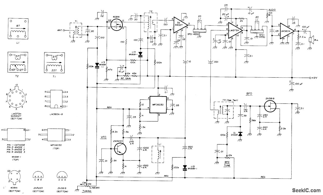 Miniaturized communication receiver was developed for use as tunable IF fed by external converter for all-band coverage up to 30 MHz, Motorola MVAM-1 triple tuning diode serves in place of customary three-gang tuning capacitor. Two Murata SFD-455D ceramic filters provide IF selectivity. MFC6030 voltage regulator provides around 7 VDC with regulation required for diode tuning. Regulator also supplies VFO and BFO. Standard 3/8-in diameter 455-kHz transistor IF transformers were stripped and used for coil forms. T3 is 455-kHz IF with secondary changed to 1 turn. Remove pins 4, 6, and 8 from Silicon General SG3402T mixer.-R. Megirian, Design Ideas for Miniature Communications Receivers, Ham Radio, April 1976, p 18-25.