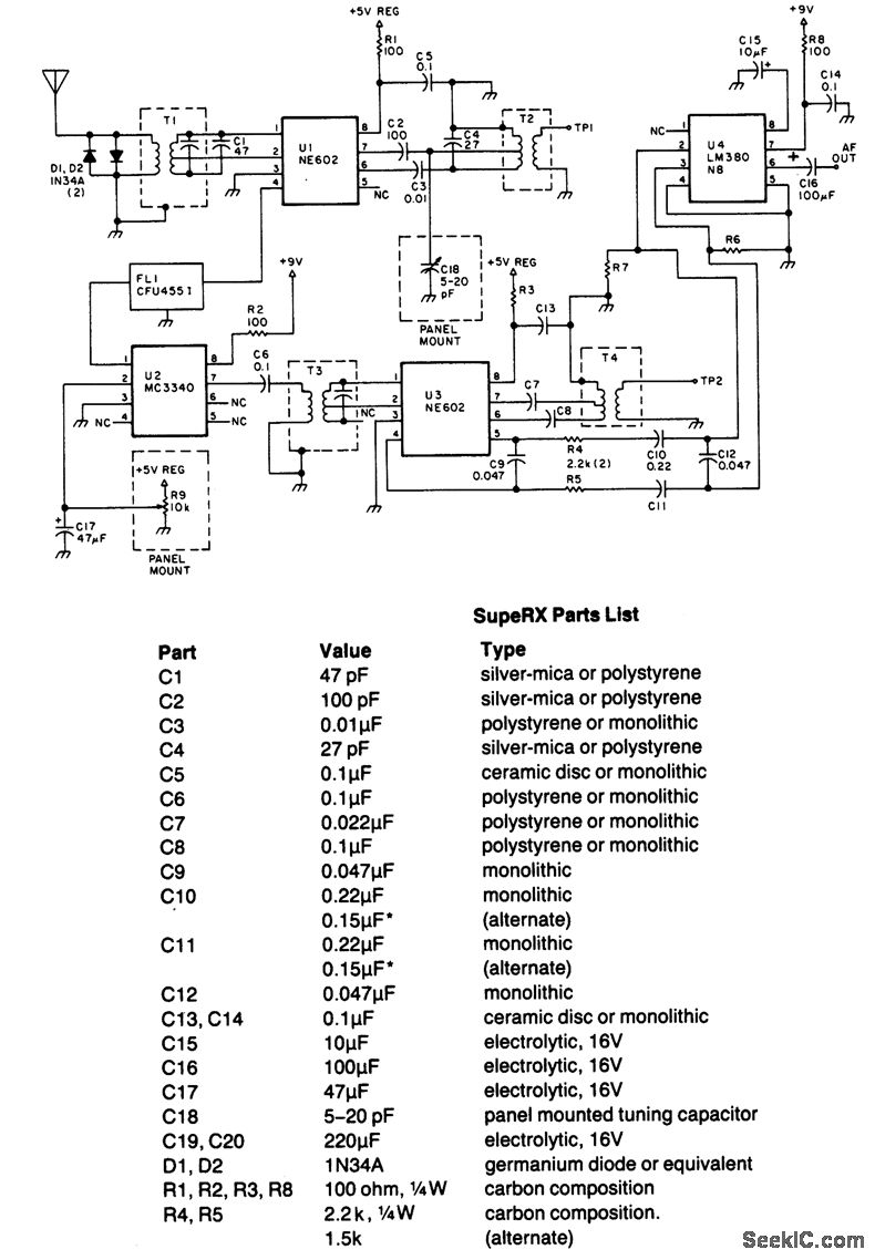 In this circuit,U1 is a frequency converter that feeds the 455-kHz IF stage U2 and detector U3. U4 is the audio output stage. R9 is a gam control that vanes the gam of U2.Coil dataisgtven h the part list.