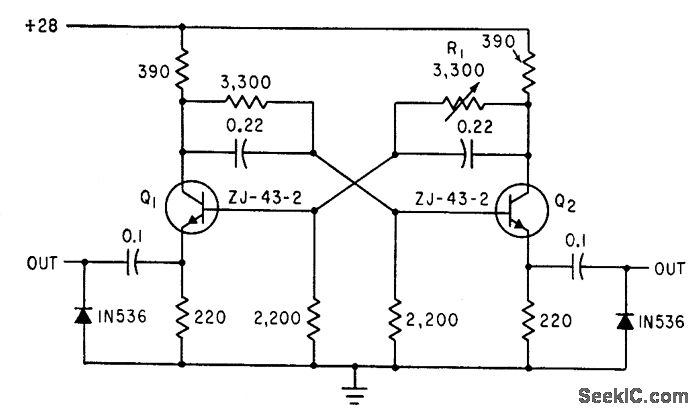 Two outputs from mvbr give alternating trigger pulses to each rectifier. R1 is adjusted for symmetrical operation.-D. V. Jones, Turn-Off Circuits for Controlled Rectifiers, Electronics, 33:32, p 52-55.