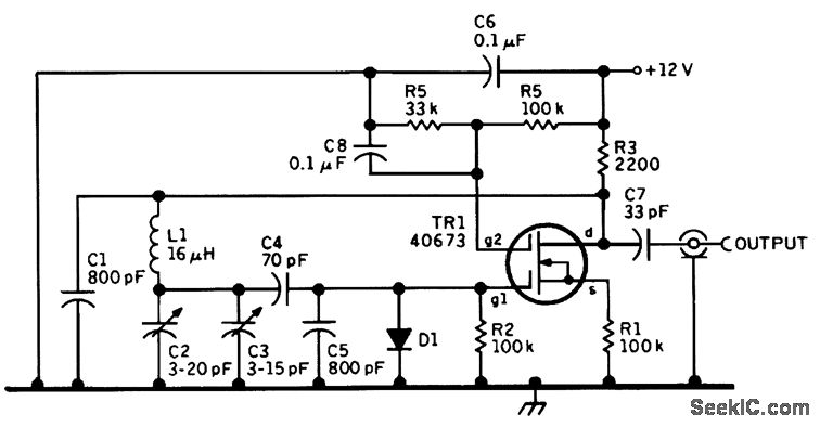 This is a recent 4.0- to 4.3-MHz oscillator design by KGBSU. It seems likely that performance could be improved by increasing the value of C2=C3 and decreasing that of L1 to make the device a true Vacker oscillator. The following component information is recommended by KGBSU: C1 and C5, 800-pF polystyrene; C2, air trimmer for setting calibration, C3, air variable for main tuning; C4, 70-pF, NPO ceramic and silver mica to provide required temperature compensation; C7, 33-pF NPO ce-ramic; C6 and C8, 0.1-μF 25-Vmonolithic capacitor; TR1, 40673 or SK3050 dual-gate MOSFET; D1, 1N4153 or 1N914 silicon signal diode; L1, 16-μF, 34 turns #26 enameled on 3/4-in diameter ceramic form (no slug core), winding length 0.6 inch; all resistors 0.25 W, 5 percent.