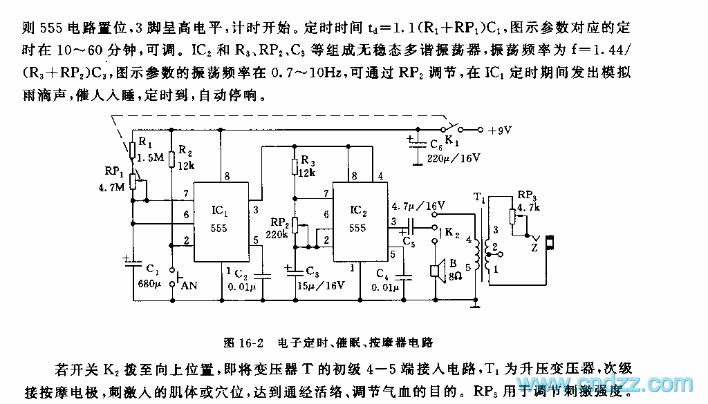 As the figure 16-2 shows, the monostable timing circuit is composed of the IC1 and R1,RP1,C1, An is the timing start-up button, if you press AN, the 555 circuit sets, pin-3 has the high electrical level, and the timing begins. The timing time td=1.1(R1+RP1)C1, the corresponding timing time of the figure parameters is between 10 to 60 minutes, and it is adjustable. The astable multivibrator is composed of the IC2 and R3,RP2,C3, the oscillation frequency f=1.44/(R3+RP2)C3, the figure parameters' oscillation frequency is 0.7-10Hz, you can adjust it by RP2, during the IC1's timing time, this circuit sends out the voice of raindrop to encourage people to sleep, when the timing time is up, it automatically stops the sound.