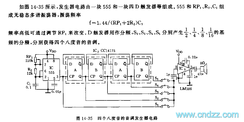 As the figure 14-35 shows, the generator circuit is composed of one piece of 555 and a four-D trigger. The astable multivibrator is composed of the 555 and RP1, R2, C1, the oscillation frequency f=1.44/(RP1+2R2)C1, the frequency can be changed by adjusting the RP1. The trigger D can be used as the frequency divider, S2,S3,S4 and S5 produce the 1/2,1/4,1/8 and 1/16 frequency divisions of the fundamental frequency, so we get four octave tones.