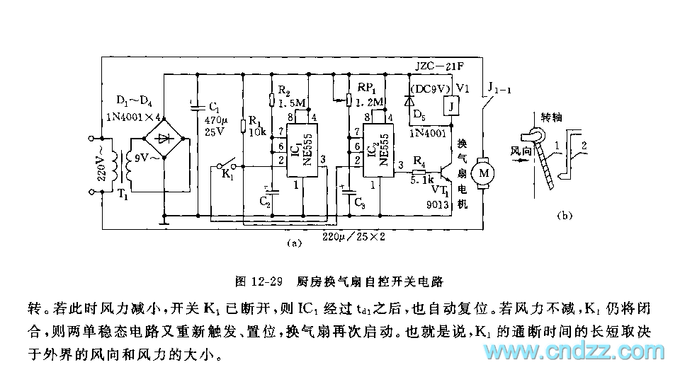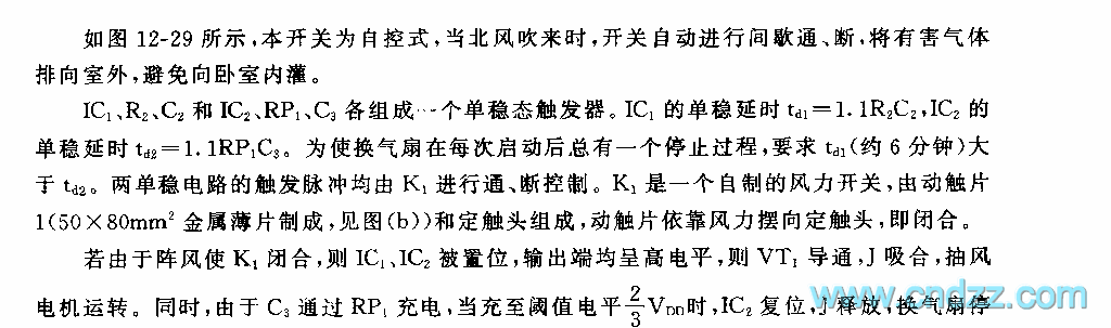 As shown in the figure 12-29, this switch is self-control, when the north wind blows, the switch can automatically turns on/off intermittently, the harmful gas will be discharged to outdoor, it avoids the gas filling into bedroom. If K1 is closed due to the wind, IC1, IC2 are set, the output terminal is high level, VT1 turns on, J pulls in, suction fan runs. At the same time, C3 is charged by RP1, when it is charged to 2/3 VDD of the threshold value level, IC2 is reset, J is discharged, the ventilator stops to running. If the wind power decreases, switch K1 cuts off, then IC1 automatically resets by td1. If the wind power does not decrease, K1 is still closed, then two monostable circuit trigger and set again, ventilator starts again. In other words, the on/off time of K1 is decided by the outside wind direction and the wind power.