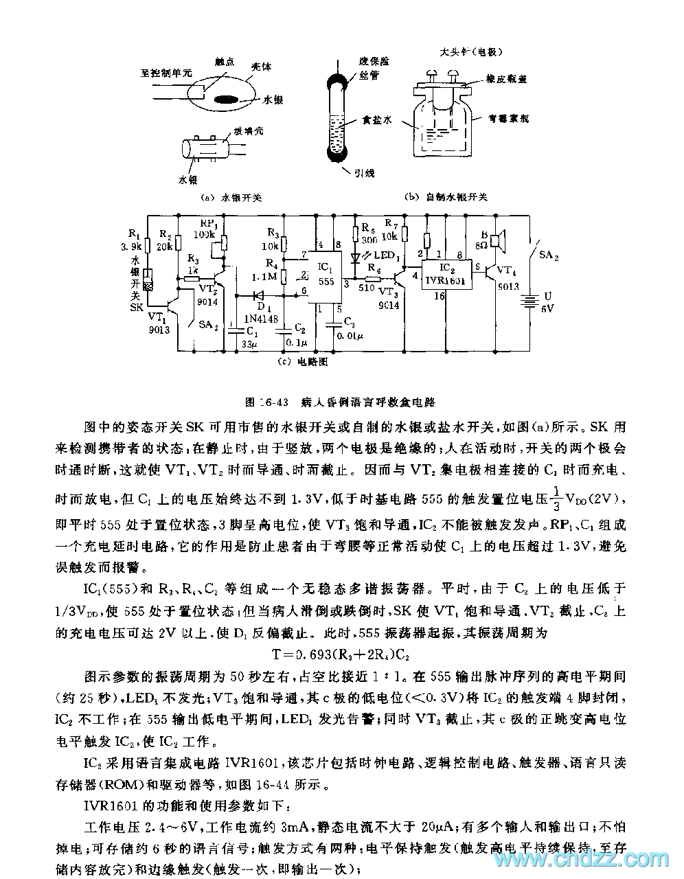 The language alarm box is composed of the posture switch, the oscillating circuit and the language alarm circuit, as the figure 16-43 shows.
