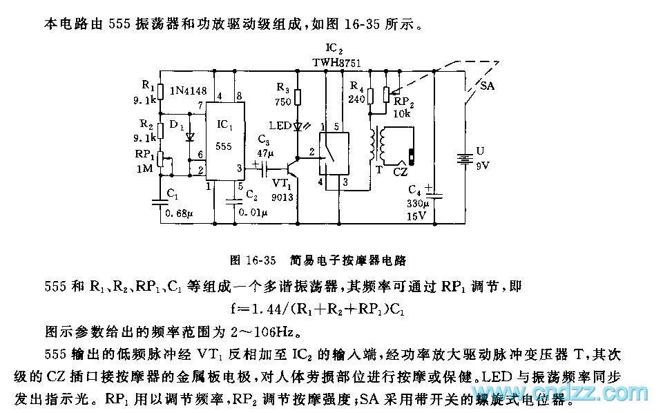 The low frequency pulse of 555 is reversed by VT1, and it adds to IC2's input port, then it is amplified by the power tube to drive the pulse transformer T, the subprime CZ socket connects to the metal plate electrode of massager to massage the human body strain parts. The RP1 can be used to adjust the frequency, the RP2 can be used to adjust the massage strength, SA uses the spiral potentiometer with the switch.