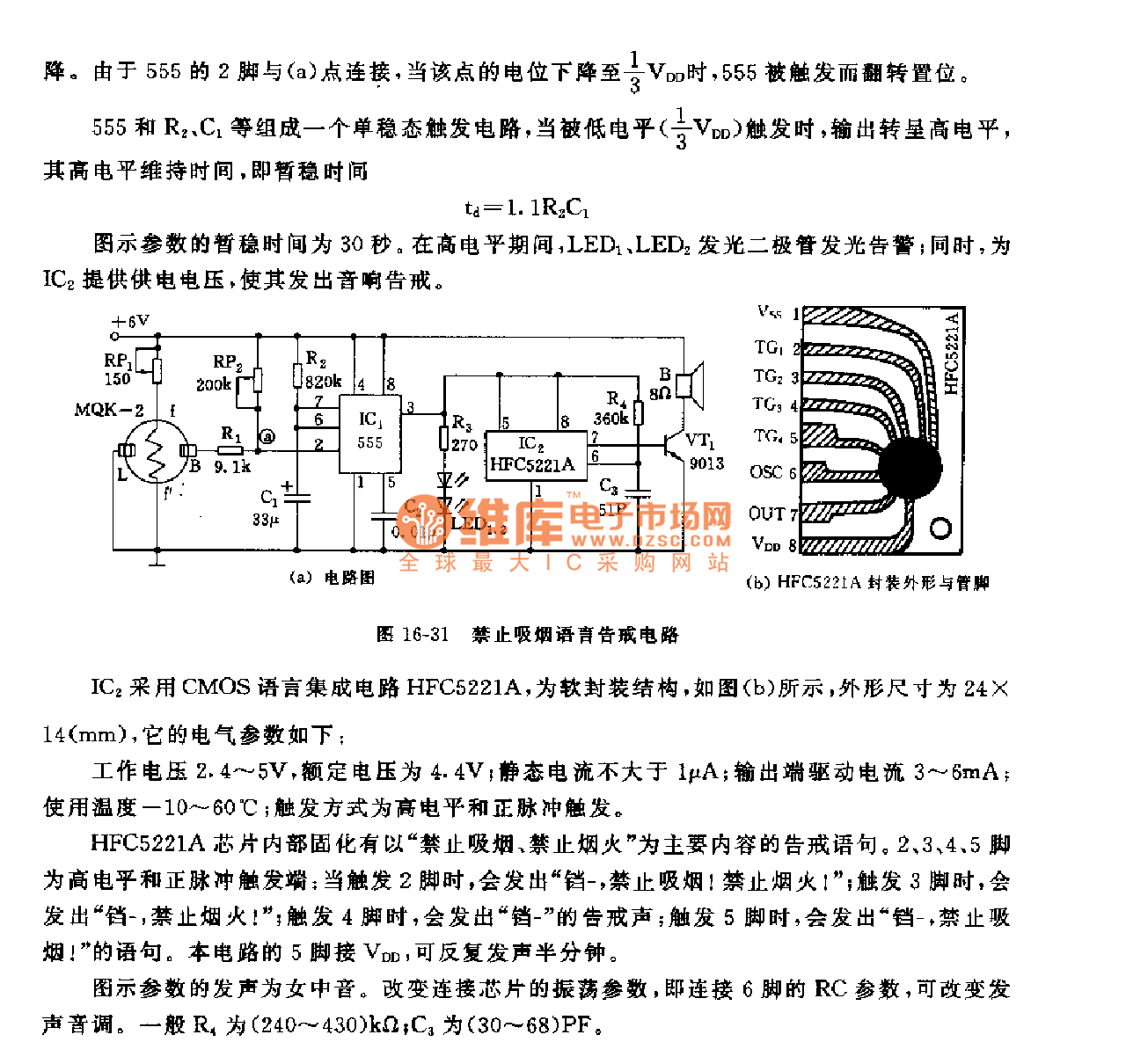 The IC2 uses the CMOS language integrated circuit HFC5221A, the soft package structure is as shown in figure (b), the shape dimension is 24mm x 14mm, it's electrical parameters are: