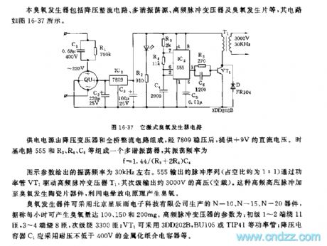 The figure parameter's oscillation frequency is about 30 kHz. The 555 output pulse sequence (the duty ratio is about 1:1) drives the high-frequency pulse transformer T1 through the power tube VT1, the bubprime output voltage is about 3000V. This kind of high-frequency high-voltage pulse adds to the ozone generating pottery to produce the ozone by the corona discharging principle.