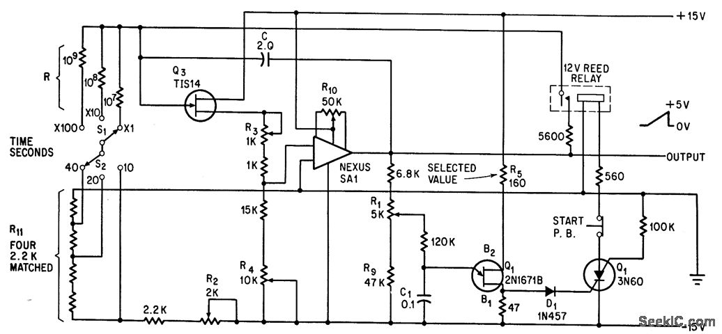 Switches S1 and S2 give ramp periods of 100 to 4,000 sec. Changing C to 10 mid increases period to 20,000 sec. For 5-hour period, C must be 10-mfd low-leakage capacitor. R1 calibrates ramp amp litude and R2 calibrates period.-R. Chapman Period of Sawtooth Ramp Extends to 5 Hours, Electronics, 39:13, p 78.