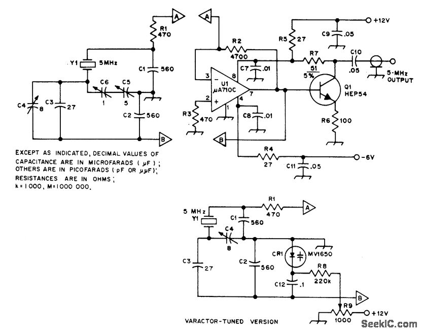 Guriot-Clapp crystal oscillator using broadband high-gain opamp U1 can be tuned by conventional variable capacitor C5 or alternatively by Motorola MV1650 varactor CR1. Buffer Q1 minimizes effect of loading on frequency.-R. Silberstein, An Experimental Frequency Standard Using ICs, QST, Sept. 1974, p 14-21 and 167.