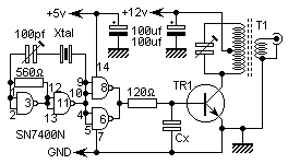 This is a very simple 5 watt CW TX based upon a TTL logic chip. There is just one tricky component and this is Cx. This component should have an impedance of about 10 - 50 ohms at the frequency of interest. If you wish to reduce the transmitter power, increase the value of Cx. It is Cx which causes the square wave from the output transistor to approximate a sine waveform. The value of Cx is the price of simplicity in this TX.