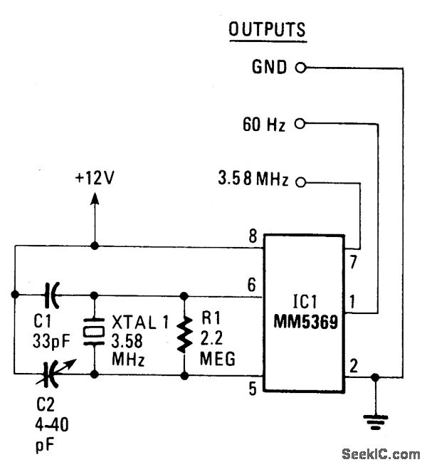 The circuit provides a clean, stable square wave and it will operate on anywhere from 6 to 15 volts. The IC and color-burst crystal are the kind used in TV receivers. The 3.58 MHz output makes a handy marker signal for shortwave bands.