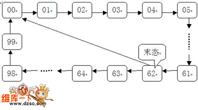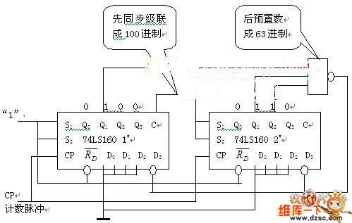 63 nary counter formed by cascade preset number circuit: We can also form 10i counter or 16i counter by the cascade method and use the preset method to constitute an arbitrary nary counter. 63 nary counter can be formed by 100 nary counter composed of two 10 nary counters (74LS160) and then can achieve the function by preset method. Its counting state transition is shown in Figure 2. It should be noted that 74LS160 has a synchronous preset number features and has no transition state.